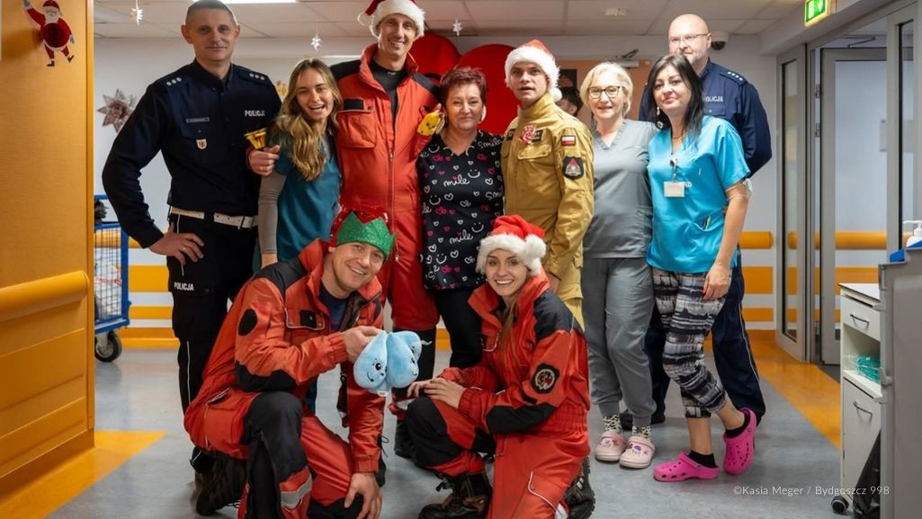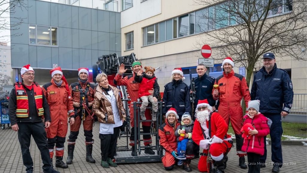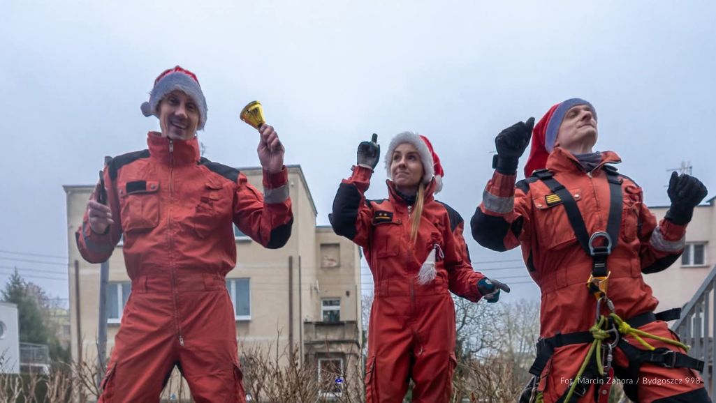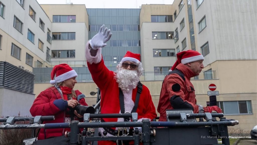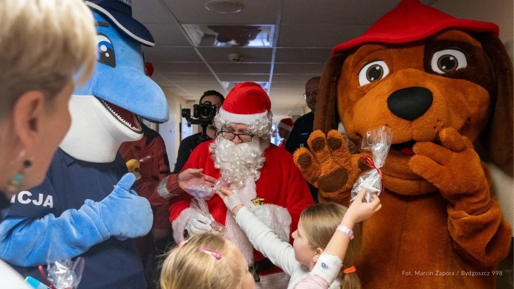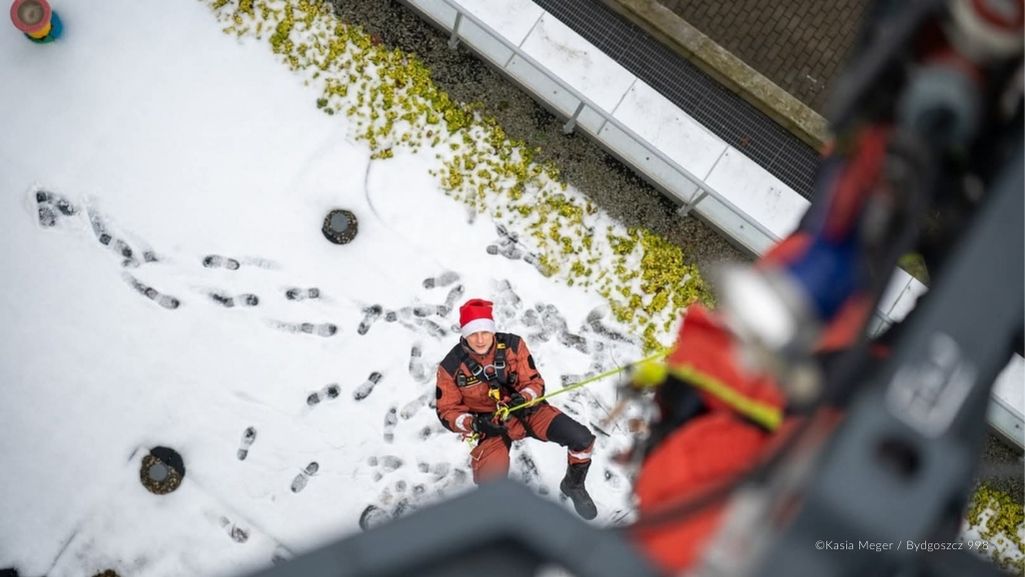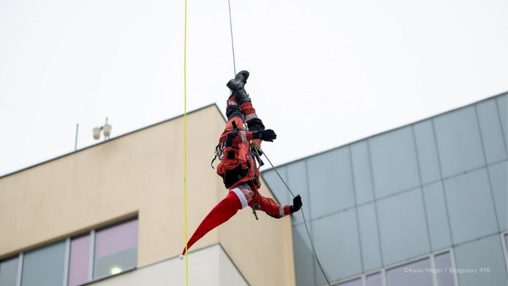 Specjalistyczna Grupa Ratownictwa Wysokościowego z JRG 3 w Bydgoszczy po raz kolejny przygotowała dla pacjentów pełne emocji mikołajkowe niespodzianki. Dzieci mogły podziwiać efektowne, ekwilibrystyczne zjazdy strażaków na linach oraz przywitać się ze Świętym Mikołajem, który – wznoszony na strażackiej platformie – pukał do ich okien. Następnie wyjątkowi goście odwiedzili pacjentów w szpitalnych oddziałach. Strażacy, policjanci z Komendy Miejskiej Policji w Bydgoszczy, wolontariusze Caritas Diecezji Bydgoskiej wraz ze Strażackim Pieskiem, delfinkiem Polfinkiem i Serduszkiem Caritasu obdarowali dzieci świątecznymi upominkami ufundowanymi przez darczyńców i sponsorów.